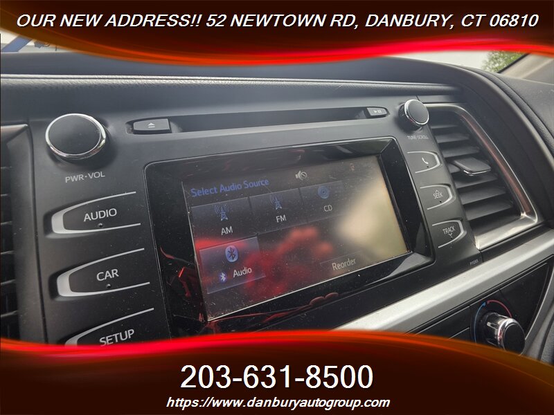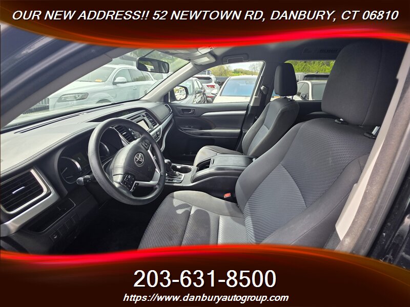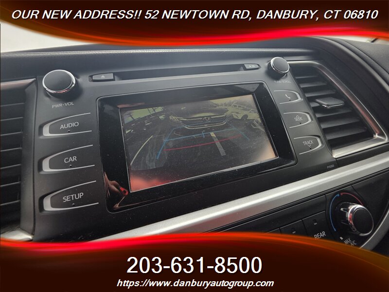 2016 Toyota Highlander LE — Midnight Black Metallic exterior, Black cloth interior, powered by the punchy 3.5L V6 (270 hp / 248 lb-ft) with smooth 6-speed automatic and rated 18 MPG city / 24 MPG highway. Factory-equipped with three-row seating for up to eight, durable black cloth upholstery, remote keyless entry, power windows/locks/mirrors, cruise control, tilt/telescoping steering wheel with audio and Bluetooth phone controls, Entune infotainment with AM/FM/CD, USB/AUX and Bluetooth audio, rearview camera, automatic climate control with rear vents, roof rails, alloy wheels, ABS with EBD and brake assist, traction and stability control, full complement of airbags and tire-pressure monitoring. Excellent overall condition with a clean CARFAX — this one moves fast, so don’t wait.