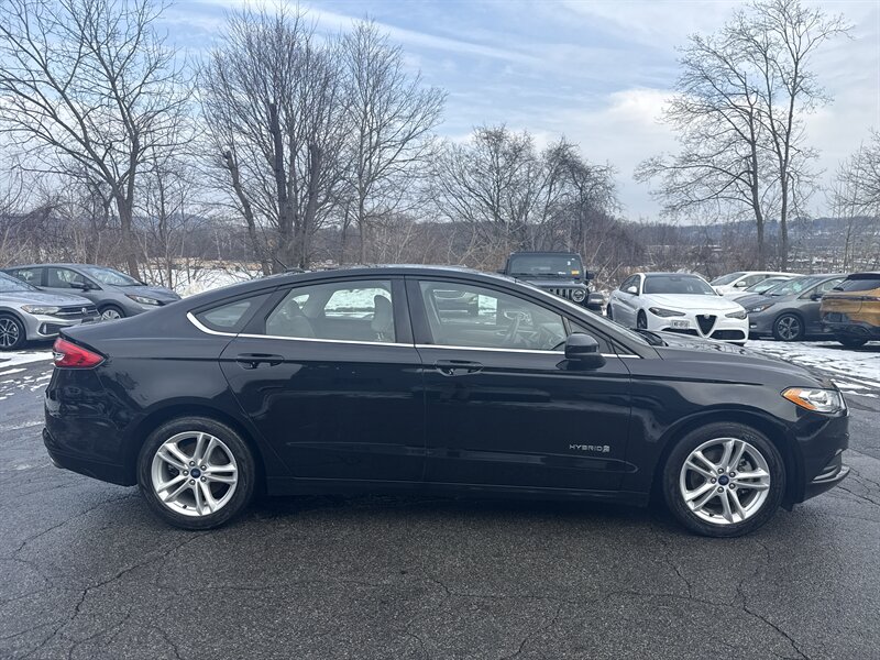 2018 Ford Fusion Hybrid S in Shadow Black with Medium Light Stone cloth interior. Powered by a 2.0L hybrid I4 with a combined 188 hp and an electronic continuously variable transmission, this Fusion returns an EPA-rated 43 MPG city and 41 MPG highway. Below 74,000 miles (averaging under 9,000 miles per year), in excellent overall condition with a clean CARFAX. Factory-standard equipment includes cloth seating, manual air conditioning, power windows and locks, remote keyless entry, cruise control, tilt/telescoping steering wheel, Ford SYNC with Bluetooth and USB/AUX inputs, a rearview camera, and standard safety systems such as ABS, traction and stability control, and multiple airbags.