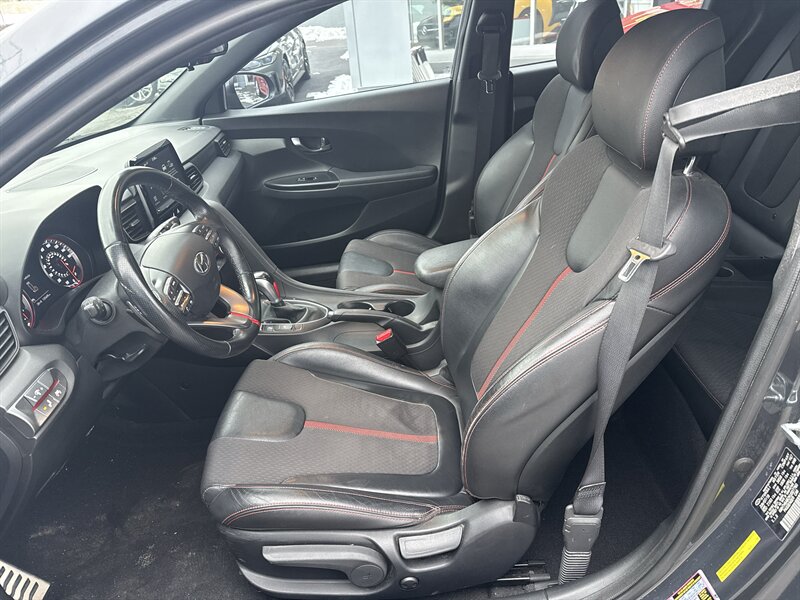 2019 Hyundai Veloster Turbo R-Spec — Thunder Gray/Black exterior, Black leather-trimmed interior, and a torquey Gamma 1.6L Turbo I4 delivering 201 hp and 195 lb-ft. Mated to a crisp 6-speed manual, this R-Spec comes factory-equipped with a sport-tuned suspension, 18-inch alloy wheels, center dual-exit exhaust, projector headlights with LED daytime running lights and rear spoiler. Interior and tech: leather-trimmed sport seats, 7-inch touchscreen with Apple CarPlay/Android Auto and Bluetooth, rearview camera, power windows/locks, cruise control and steering-wheel audio/phone controls. Safety: ABS, stability and traction control, multiple airbags and tire pressure monitoring. Rated 26 MPG city / 33 MPG highway, excellent overall condition, clean CARFAX and one owner — serious performance, no excuses.