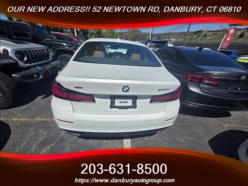2021 BMW 530i xDrive — White exterior, tan leather interior, driven by a 2.0L Turbo I4 with 248 hp and 257 lb-ft paired to an 8-speed automatic and xDrive AWD. EPA 23 MPG city / 32 MPG highway. Factory-equipped with leather seating, power multi-way front seats with memory, dual-zone automatic climate control, power moonroof, LED headlights, keyless entry with push-button start, BMW iDrive infotainment with smartphone integration (Apple CarPlay/Android Auto), Bluetooth/USB, full digital instrument cluster, premium audio, rearview camera with parking sensors, alloy wheels and a complete safety suite (ABS, stability/traction control, multiple airbags). Excellent overall condition with a clean CARFAX — ready to dominate the road.