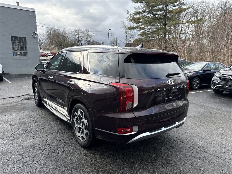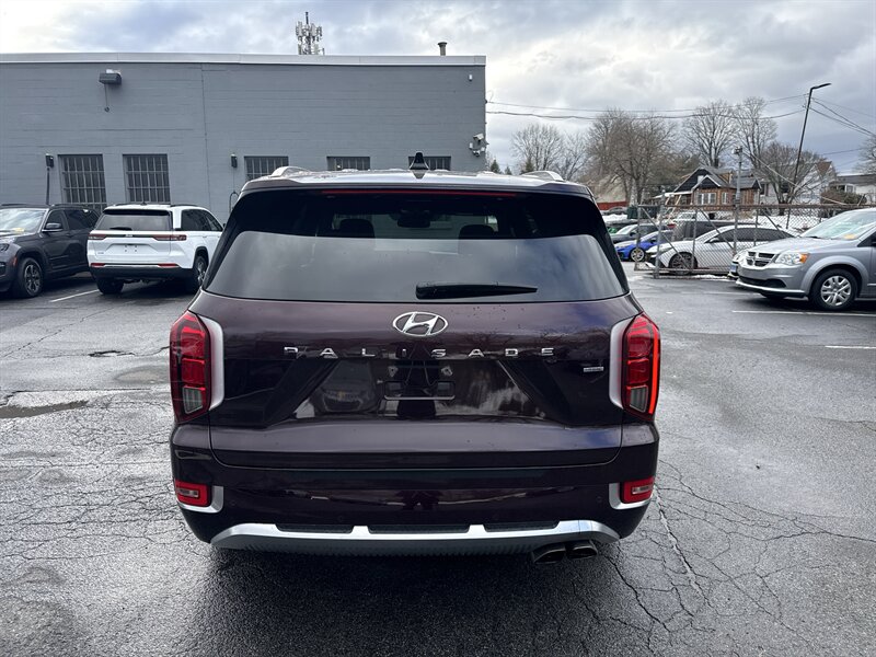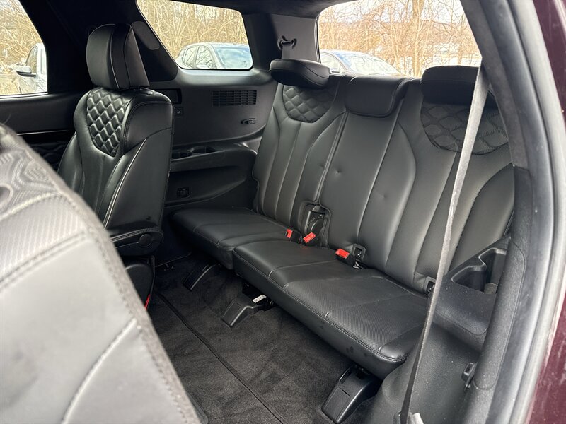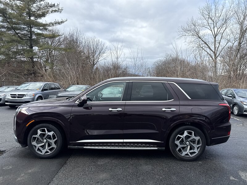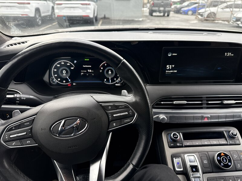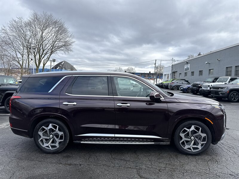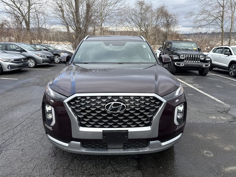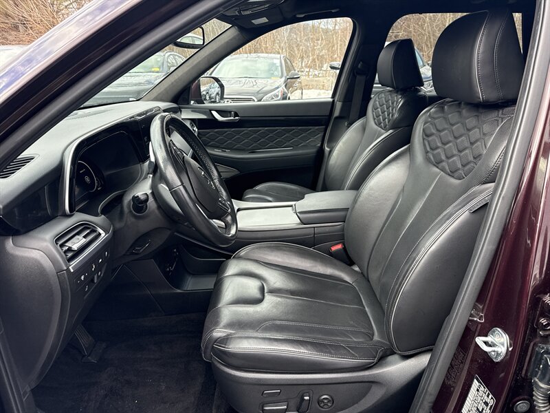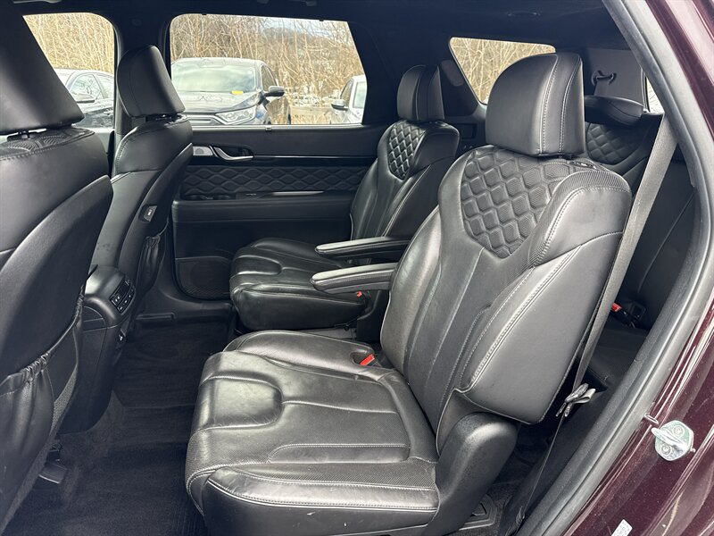 This 2021 Hyundai PALISADE Calligraphy in eye-stopping Sierra Burgundy is all business — powerful, loaded, and flawless. Powered by the factory 3.8L V6 (291 hp, 262 ft-lbs) mated to a smooth automatic and delivering 19 MPG city / 24 MPG highway, this top-trim SUV commands the road. Factory equipment includes premium Black Nappa leather with quilted accents, heated and ventilated front seats, heated second-row seating, heated steering wheel, power-adjustable front seats with memory, panoramic sunroof, hands-free power liftgate and power-folding third row, exclusive 20-inch wheels and chrome Calligraphy exterior trim. Tech and convenience come standard with a large navigation touchscreen with Apple CarPlay/Android Auto, wireless charging, premium audio, multi-zone climate control, keyless entry/push-button start and full driver-assist suite (forward collision mitigation, blind-spot intervention, lane-keeping assist, adaptive cruise and a 360° camera). Excellent overall condition, clean CARFAX and one owner — no drama, just a serious luxury SUV ready now.