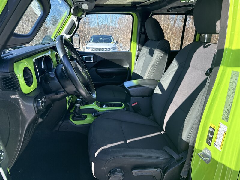 Factory default features include a durable cloth interior, a fold-down rear seat for added cargo flexibility, and an 8.4-inch touchscreen infotainment system equipped with Apple CarPlay and Android Auto for seamless connectivity. The vehicle also boasts a removable top and doors, enhancing its open-air driving experience.