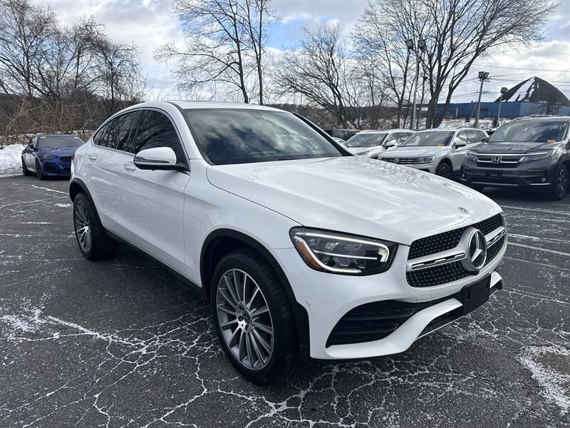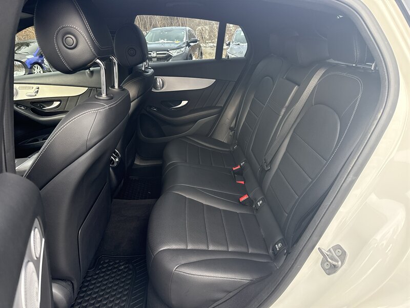 2021 Mercedes-Benz GLC 300 4MATIC in Polar White with a Black interior. Powered by a 2.0L turbo I4 (255 hp, 273 lb-ft) mated to a 9-speed automatic and Mercedes-Benz 4MATIC all-wheel drive, EPA estimates are 22 MPG city / 28 MPG highway. Factory-standard equipment includes LED exterior lighting, MBUX infotainment with touchscreen, voice control and smartphone integration (Apple CarPlay/Android Auto), Bluetooth and USB connectivity, power-adjustable front seats, dual-zone automatic climate control, power liftgate, rearview camera and keyless start, plus standard safety systems such as Active Brake Assist, Attention Assist and electronic stability/traction control. The vehicle is in excellent overall condition and has a clean CARFAX.