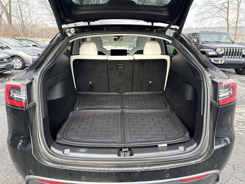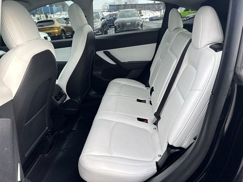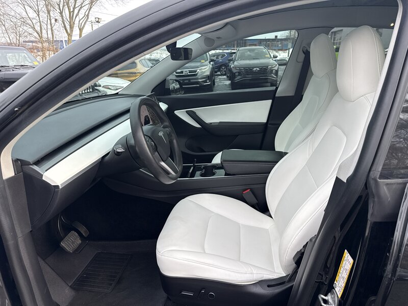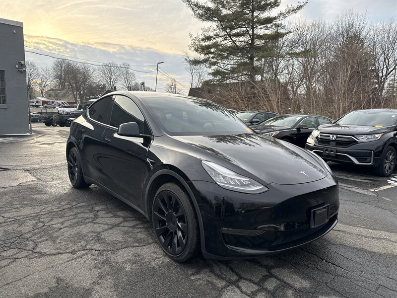 2021 Tesla Model Y Long Range — Solid Black exterior, Black interior, Electric 346 hp / 389 ft-lb. This no-nonsense SUV comes factory-equipped with Dual Motor All-Wheel Drive Long Range powertrain, standard Autopilot (Traffic-Aware Cruise Control and Autosteer assistance), 15" central touchscreen with navigation/streaming/voice control, premium synthetic-leather interior, power-adjustable heated front seats, panoramic glass roof, power liftgate, LED lighting, alloy wheels, rearview camera with parking sensors, wireless phone charging and multiple USB ports, premium audio, keyless phone-key entry, over-the-air updates and a full modern safety suite (ABS, traction/stability control, multiple airbags). Excellent overall condition with a clean CARFAX — ready to move fast.
