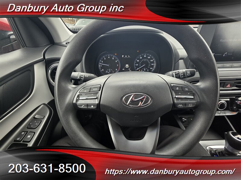 Raw power meets sharp style — this 2022 Hyundai KONA SEL in Pulse Red with a Gray interior is ready to dominate the commute. Under the hood: the Nu 2.0L I4 producing 147 hp and 132 ft-lbs of torque, delivering a crisp balance of punch and efficiency (28 MPG city / 33 MPG highway). Factory equipment is well thought out: an 8-inch touchscreen infotainment system with Apple CarPlay and Android Auto, Bluetooth hands-free calling and audio streaming, AM/FM/SiriusXM capable radio, multiple USB ports, and a rearview camera; comfortable cloth seating, power-adjustable driver seat, split-folding rear seats for cargo flexibility, automatic climate control, and keyless entry with push-button start. Safety comes from Hyundai SmartSense basics — forward collision-avoidance, lane-keeping assistance, driver attention warning and a suite of airbags for peace of mind. Excellent overall condition, clean CARFAX, one owner — this Kona SEL is sharp, loaded, and not sticking around. Act fast.