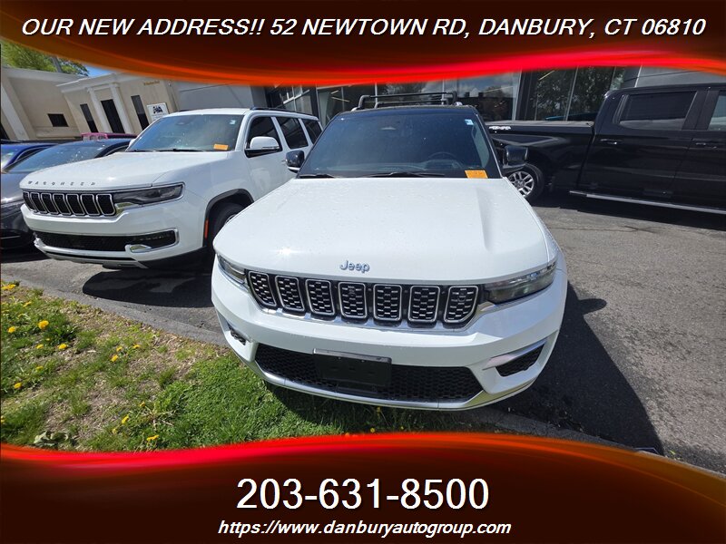 2023 Jeep Grand Cherokee Summit 4xe — Bright White Clear Coat exterior, Black interior, driven by a 2.0L Plug-in Hybrid Turbo I4 pushing 375 hp and 470 lb-ft; EPA-rated 23 MPG city / 24 MPG highway. In excellent overall condition, clean CARFAX, 1 owner.