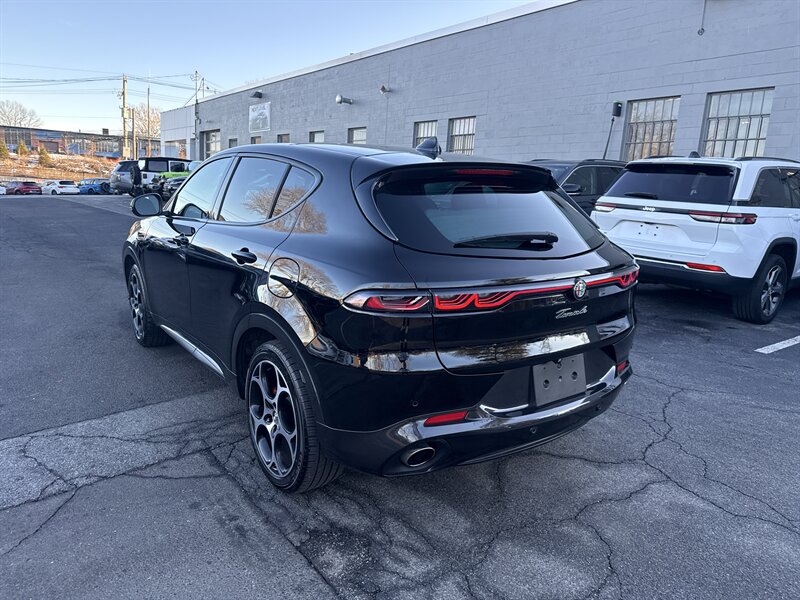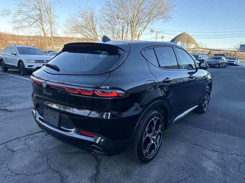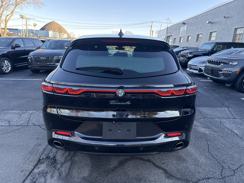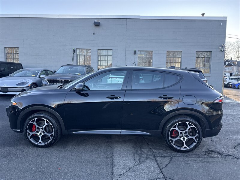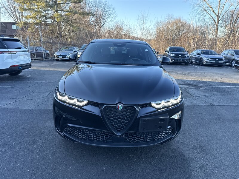 2024 Alfa Romeo Tonale Hybrid Veloce — Alfa Black exterior, Black leather-trimmed interior, driven by a 1.3L Plug-in Hybrid Turbo I4 with 285 hp and 347 lb-ft. Factory-default features include the PHEV powertrain with seamless automatic transmission and Alfa drive-mode tuning, leather-trimmed heated power front seats, dual-zone automatic climate control, keyless entry with push-button start, power liftgate, full LED lighting, premium infotainment with navigation plus Apple CarPlay/Android Auto/Bluetooth, and a full suite of driver-assist tech (adaptive cruise, lane-keep assist, blind-spot monitoring, forward collision mitigation, rear cross-traffic alert, parking sensors and backup camera). Under 23,000 miles (avg <8,000/yr), 29 MPG city / 29 MPG highway, excellent condition with a clean CARFAX — this one moves fast.