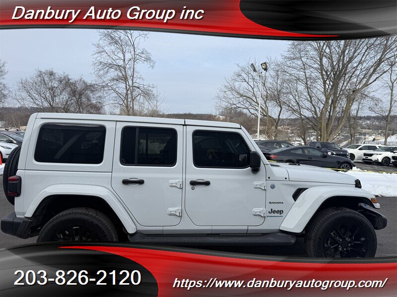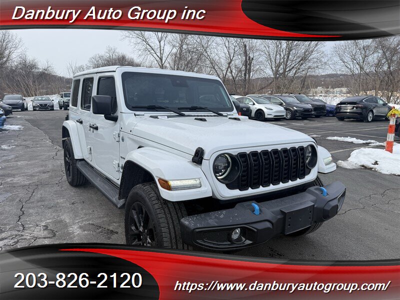 Own the trail — 2024 Jeep Wrangler Sahara 4xe in Bright White Clear Coat with Black interior, powered by the 2.0L Plug-in Hybrid Turbo I4 making 375 hp and 470 ft-lbs (electric-assist with regenerative braking and EV-only capability), EPA-rated 20 MPG city / 20 MPG highway. Factory-equipped with full-time 4WD and 8-speed automatic, removable Freedom Top and doors, Uconnect touchscreen infotainment with Apple CarPlay/Android Auto, dual-zone automatic climate control, power windows/locks, remote keyless entry and start, LED headlamps/taillamps, 18" alloy wheels, fold-flat rear seats, heavy-duty skid protection, and standard safety essentials (backup camera, multiple airbags, electronic stability and traction control, hill start/descent control). Excellent overall condition, clean CARFAX, one owner — ready to go hard.