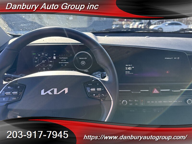 Factory-standard equipment is comprehensive: Kia Drive Wise active safety suite with forward collision-avoidance (AEB) and pedestrian detection, lane-keeping/ lane-following assist, blind-spot collision warning, rear cross-traffic alert and adaptive cruise control with stop & go; full LED exterior lighting and daytime running lights; alloy wheels; keyless entry with push-button start; dual-zone automatic climate control; heated front seats and heated steering wheel; power-adjustable driver’s seat and upscale synthetic leather seating surfaces in Black; a user-friendly touchscreen infotainment system with wireless Apple CarPlay and Android Auto, navigation capability, Bluetooth and multiple USB ports; rearview camera; regenerative braking with selectable drive modes and standard DC fast-charging capability.